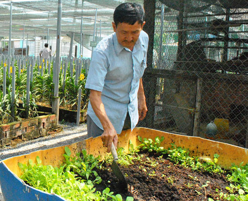 Khoảng 3 năm nay, ông Bùi Văn Sang ở phường Tân An, TP.Thủ Dầu Một đã tận dụng khoảng đất trống sau nhà để trồng rau phục vụ cho bữa ăn hàng ngày của gia đình. Chỉ với 3 vuông đất trồng cải ngọt, cà nâu, củ cải trắng và nhiều loại rau khác mà quanh năm gia đình ông Sang khỏi phải mua rau ở chợ, có khi dùng không hết ông phải chia bớt cho bà con lối xóm. Theo ông Bùi Văn Sang đất để trồng rau phải sạch, trộn xơ dừa, tro trấu, phân bò với tỷ lệ hợp lý; sau đó gieo hạt giống, tưới nước để rau nảy mầm. Phòng ngừa sâu bệnh, hàng ngày phải bắt sâu cho rau. Chỉ sau một thời gian ngắn là vườn rau đã cho thu hoạch, chất lượng rau rất ngon và hợp vệ sinh. “Hàng ngày, chăm sóc vườn rau xem như tập thể dục vừa có rau an toàn để dùng lại tiết kiệm chi phí cho gia đình”, ông Bùi Văn Sang cho biết.